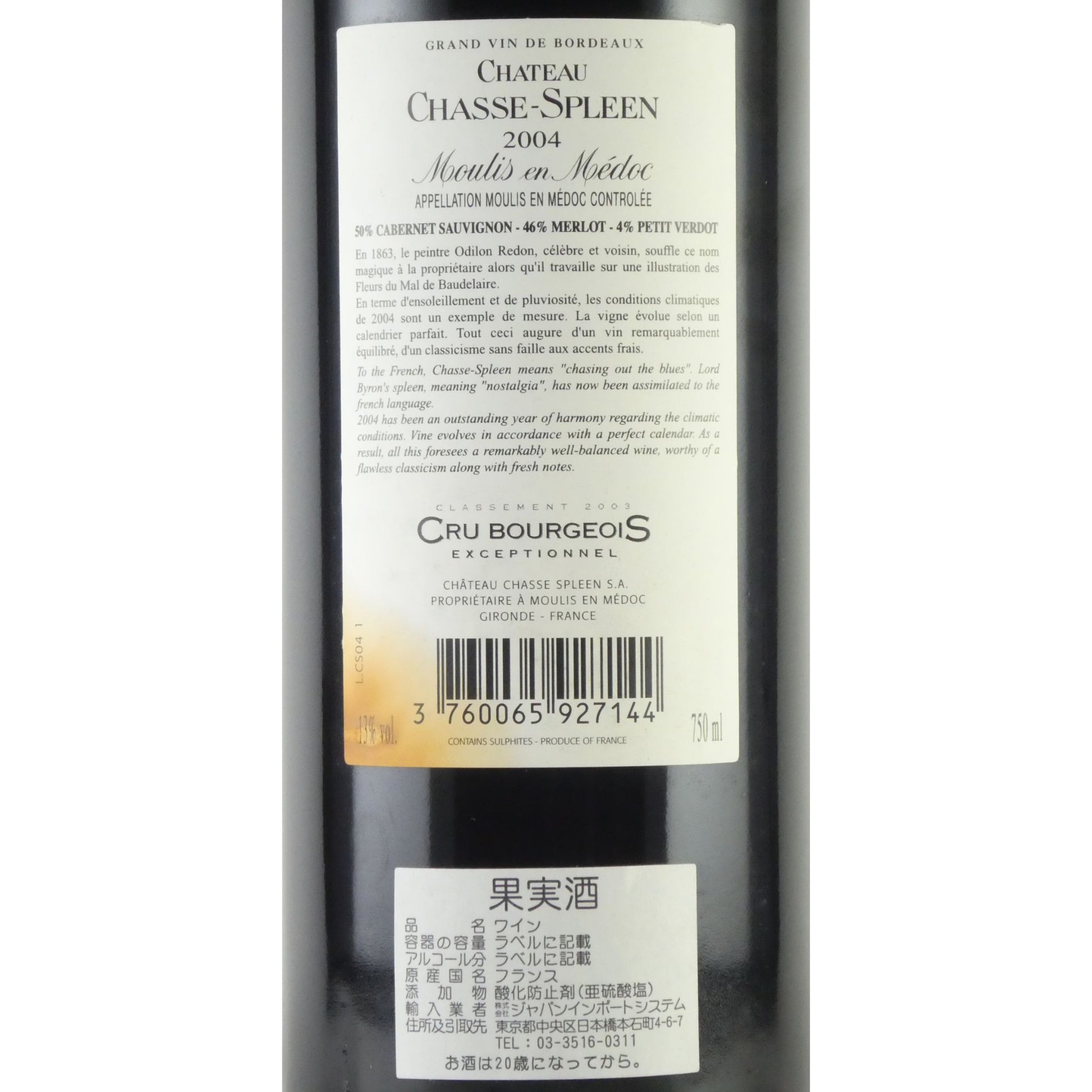 [ラベルに汚れや擦れキズ][2004年] シャトー シャス スプリーン 2004 フランス ボルドー ムーリ アン メドック 赤ワイン 750ml