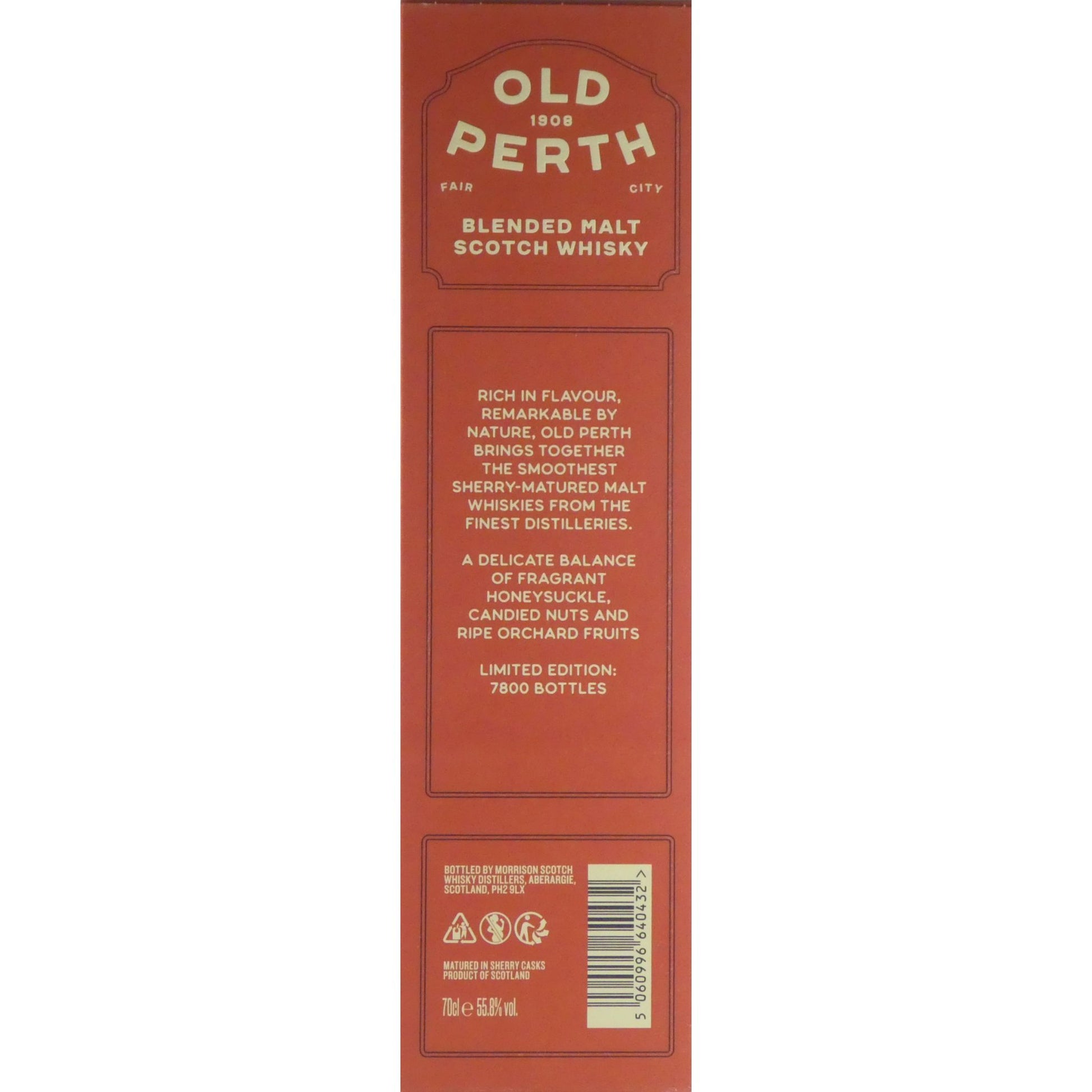 「Old Perth(オールド・パース)」は、スコットランドの名門ボトラーである Morrison Scotch Whisky Distillers(モリソン・スコッチウイスキー・ディスティラーズ) が展開するブレンデッドモルトブランドです。その名は、かつて“スコットランドのウイスキー首都”と呼ばれた街パースに由来し、19世紀から続く伝統を現代に甦らせています。